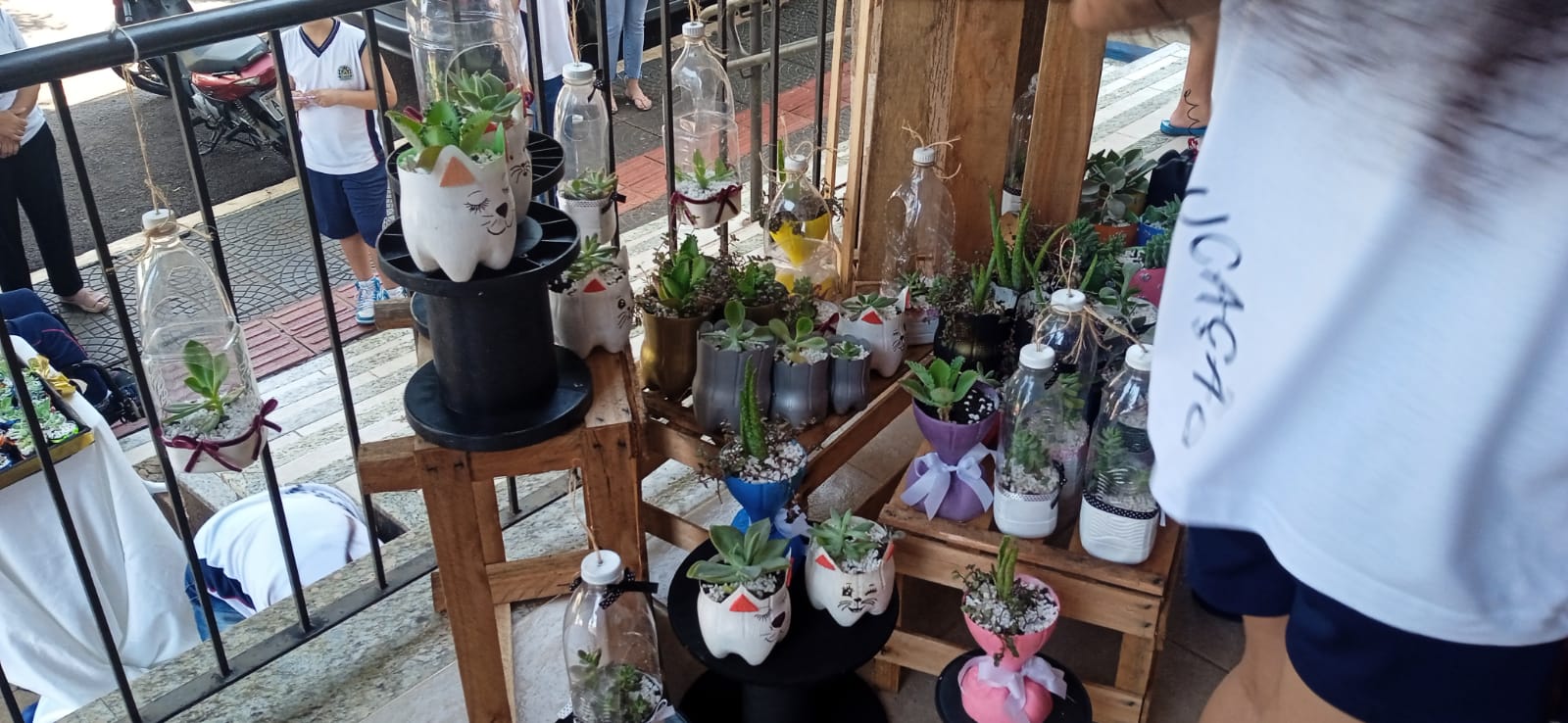 Seguindo o percurso as pessoas passavam pela banca das flores onde puderam apreciar o trabalho dos alunos que reutilizaram a garrafa pet para plantar lindas flores e demostrar que podemos decorar nossa casa reciclando.