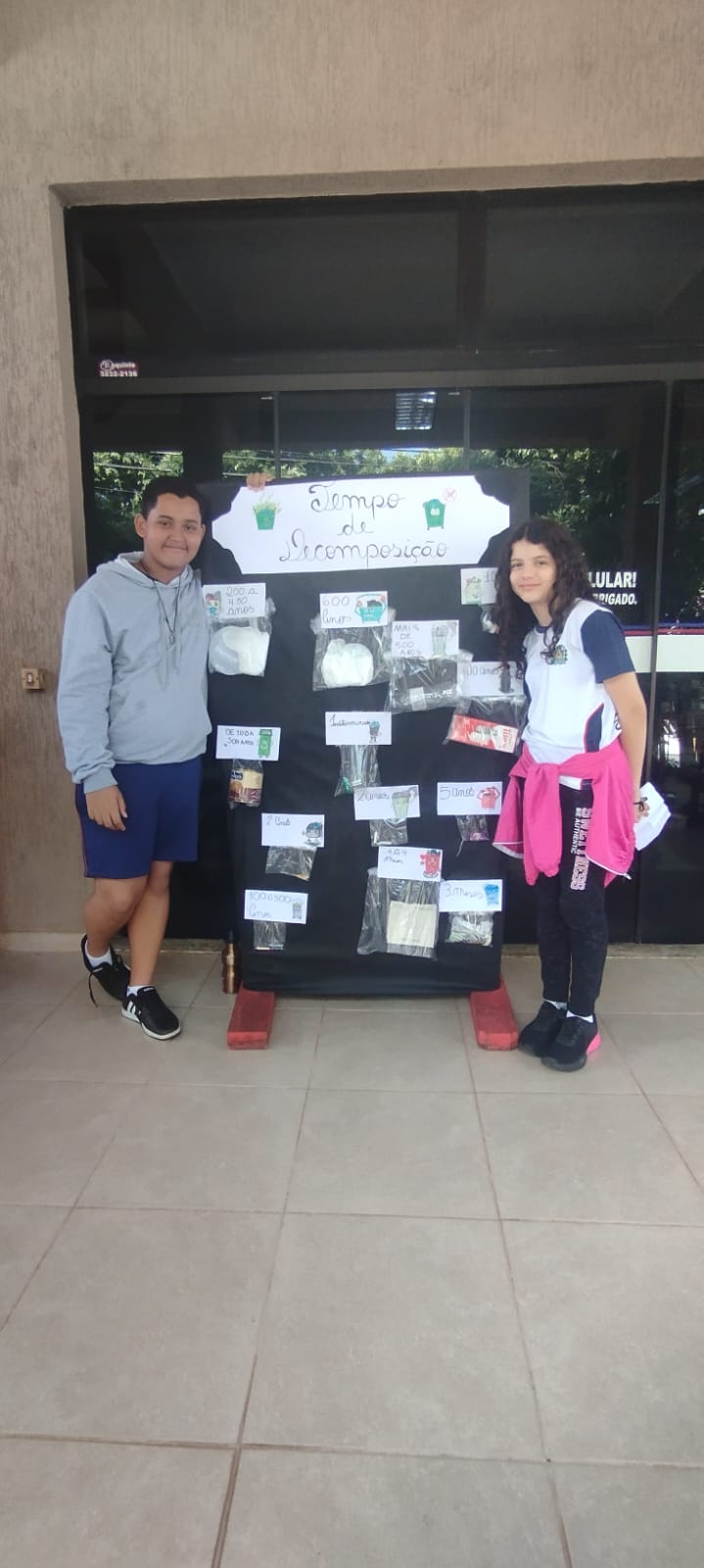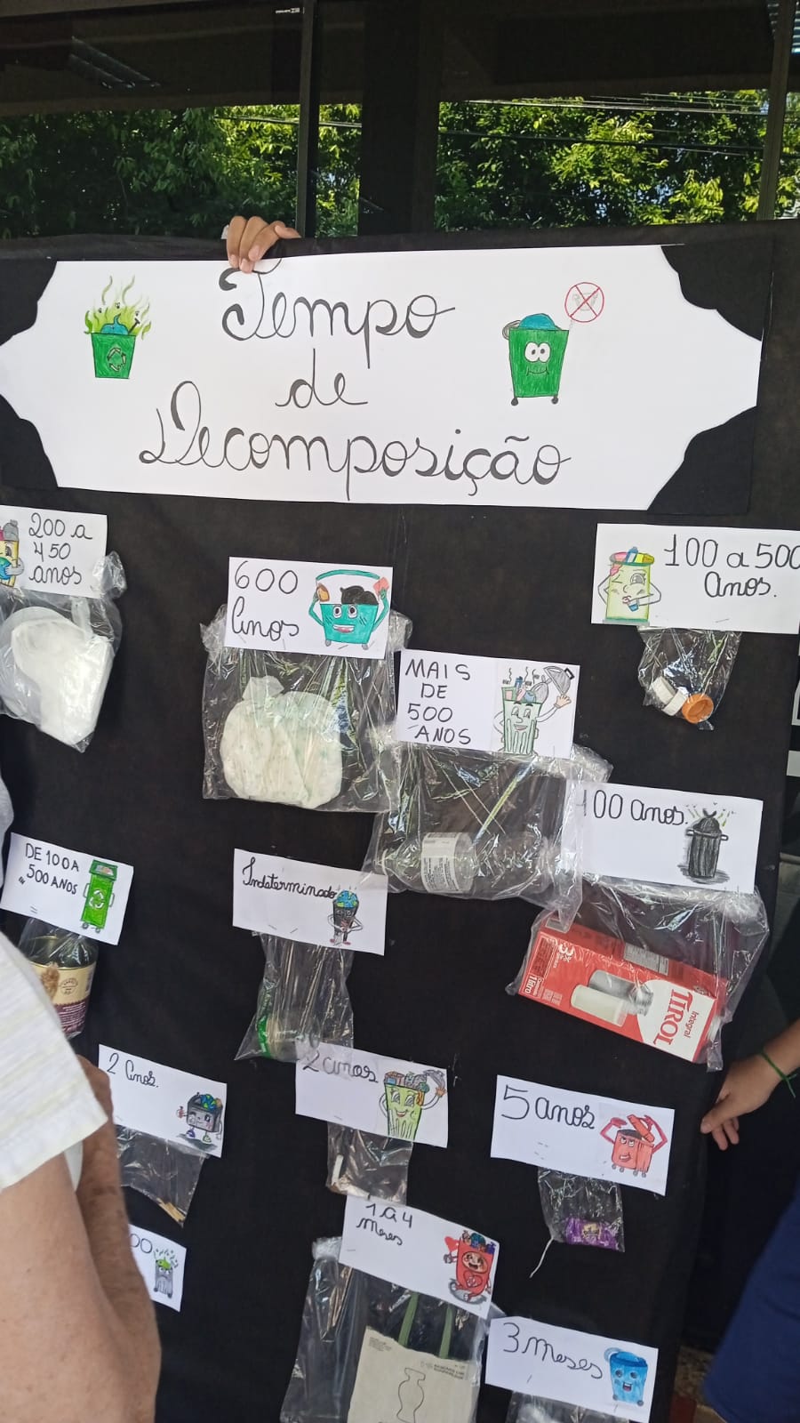 Depois de passar por essa brincadeira, as pessoas passavam por um quadro com o tema ” Tempo de Decomposição” de cada material, com um objetivo de conscientização. Um dos exemplos citados por dois alunos foi a fralda descartável que leva 600 anos para sua decomposição.
