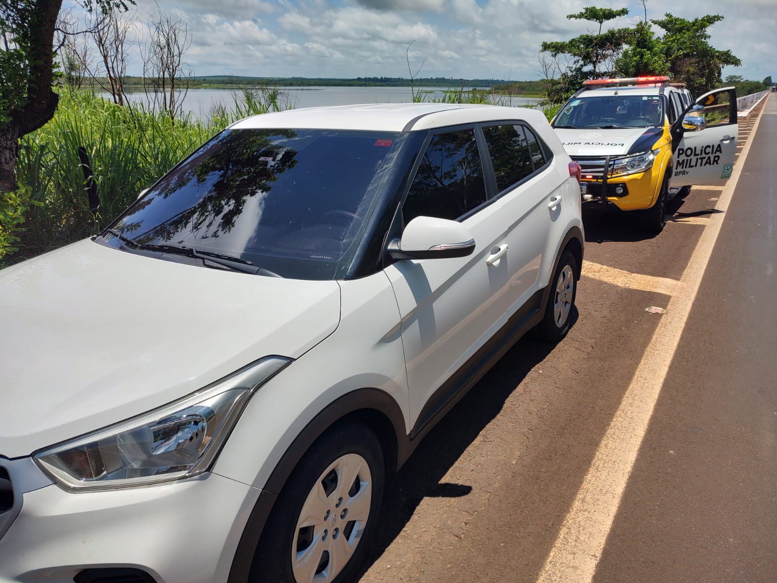 Durante patrulhamento pela rodovia estadual PR-323, quando nas proximidades do KM 21 sentido decrescente, a equipe do PRv Charles Naufal visualizou um veículo Hyundai Creta de cor branca, trafegando com alterações na suspensão traseira e com aplicação de películas excessivamente escuras.