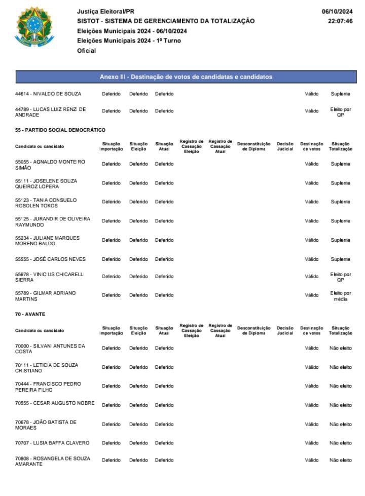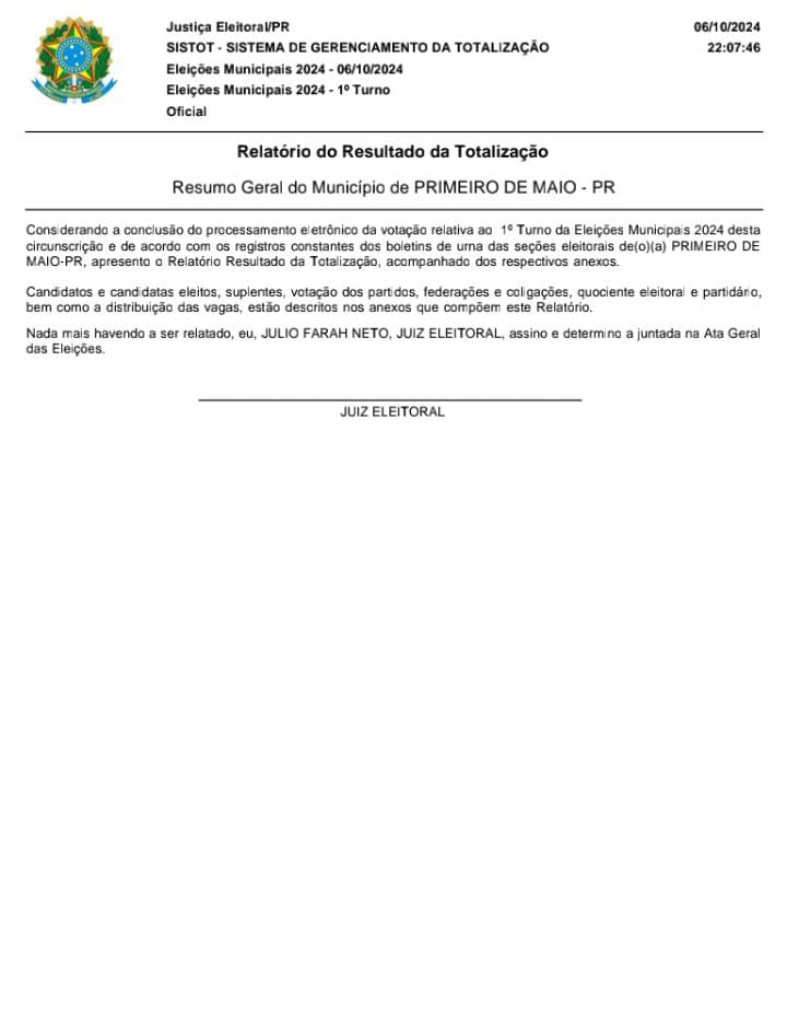 Veja o Relatório do Resultado da Totalização das  Eleições Municipais 2024 em Primeiro de Maio. Os votos de Primeiro de Maio são computados no fórum eleitoral de Sertanópolis. O Juiz Dr. Julio Farah Neto nos informou que as eleições transcorreu normalmente.