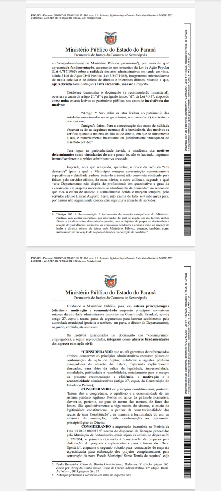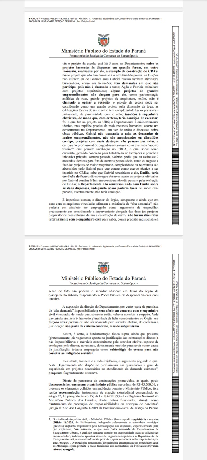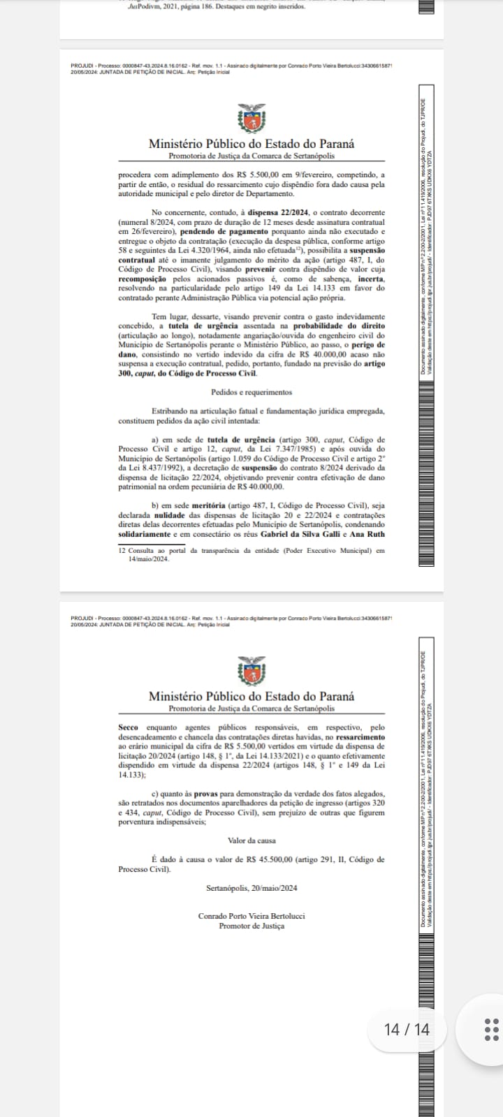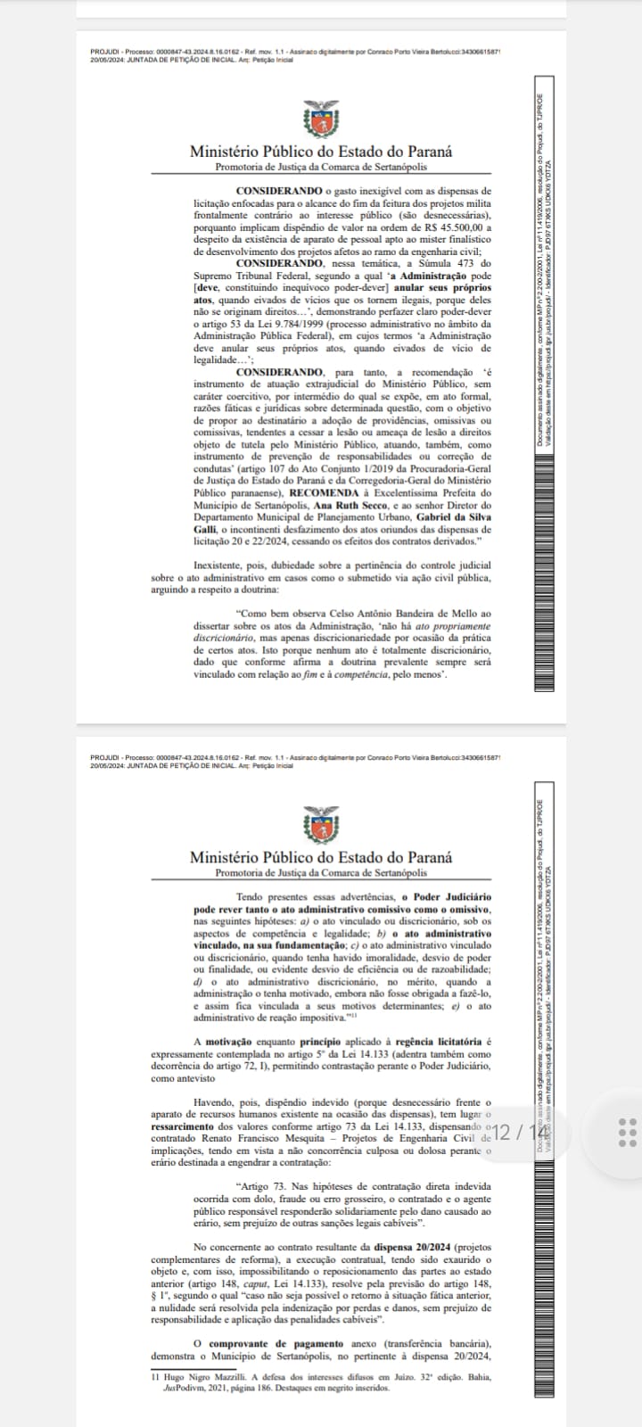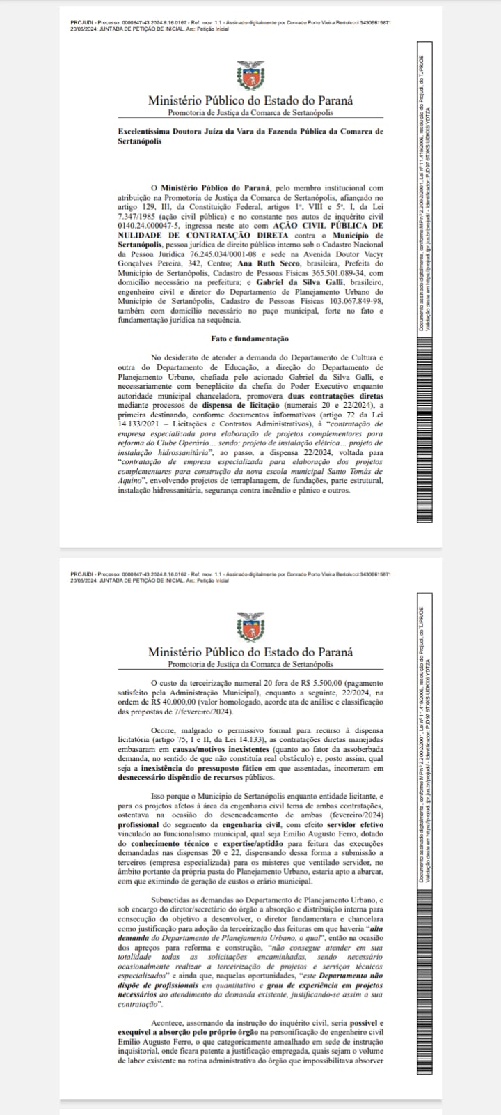 Após o Promotor de Justiça de Sertanópolis, Dr. Conrado Porto Vieira Bertolucci, apurar a notícia do fato n. 0140.24.000047-5, e emitir uma recomendação n. 01/2024 a Prefeita Municipal Ana Ruth Secco, o Ministério Público entrou com uma ação pública contra a Prefeita e o diretor do Departamento de Planejamento Urbano, Gabriel da Silva Galli.