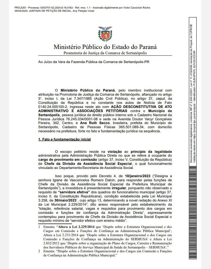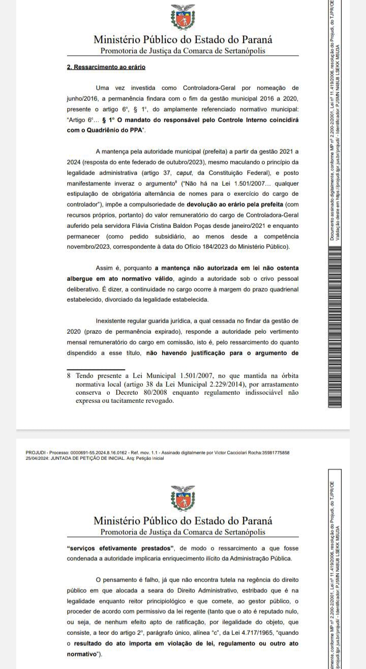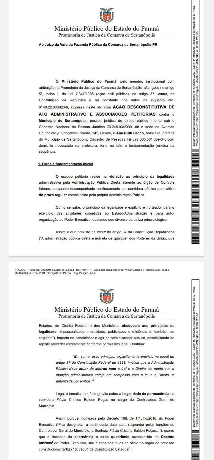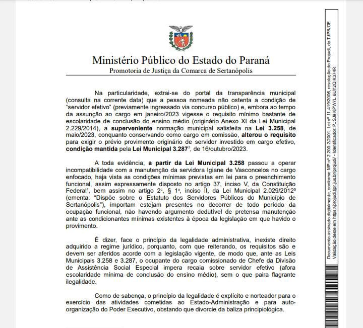 O Ministério Público, por meio da Promotoria de Justiça de Sertanópolis ingressou uma ação contra a Prefeitura de Sertanópolis por  violação ao princípio da legalidade administrativa pela Administração Pública.