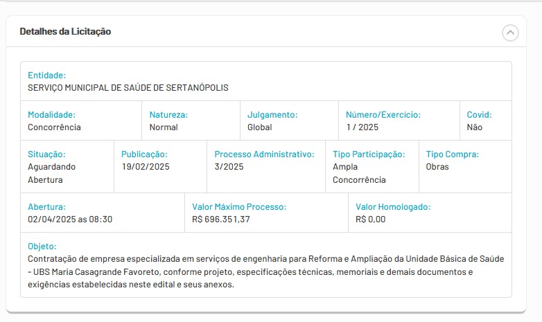 A Prefeitura Municipal de Sertanópolis, por meio do Departamento de Engenharia, irá realizar uma licitação para a reforma e ampliação da Unidade Básica de Saúde (UBS) Maria Casagrande Favoreto. A sessão de abertura da licitação está marcada para o dia 2 de abril.