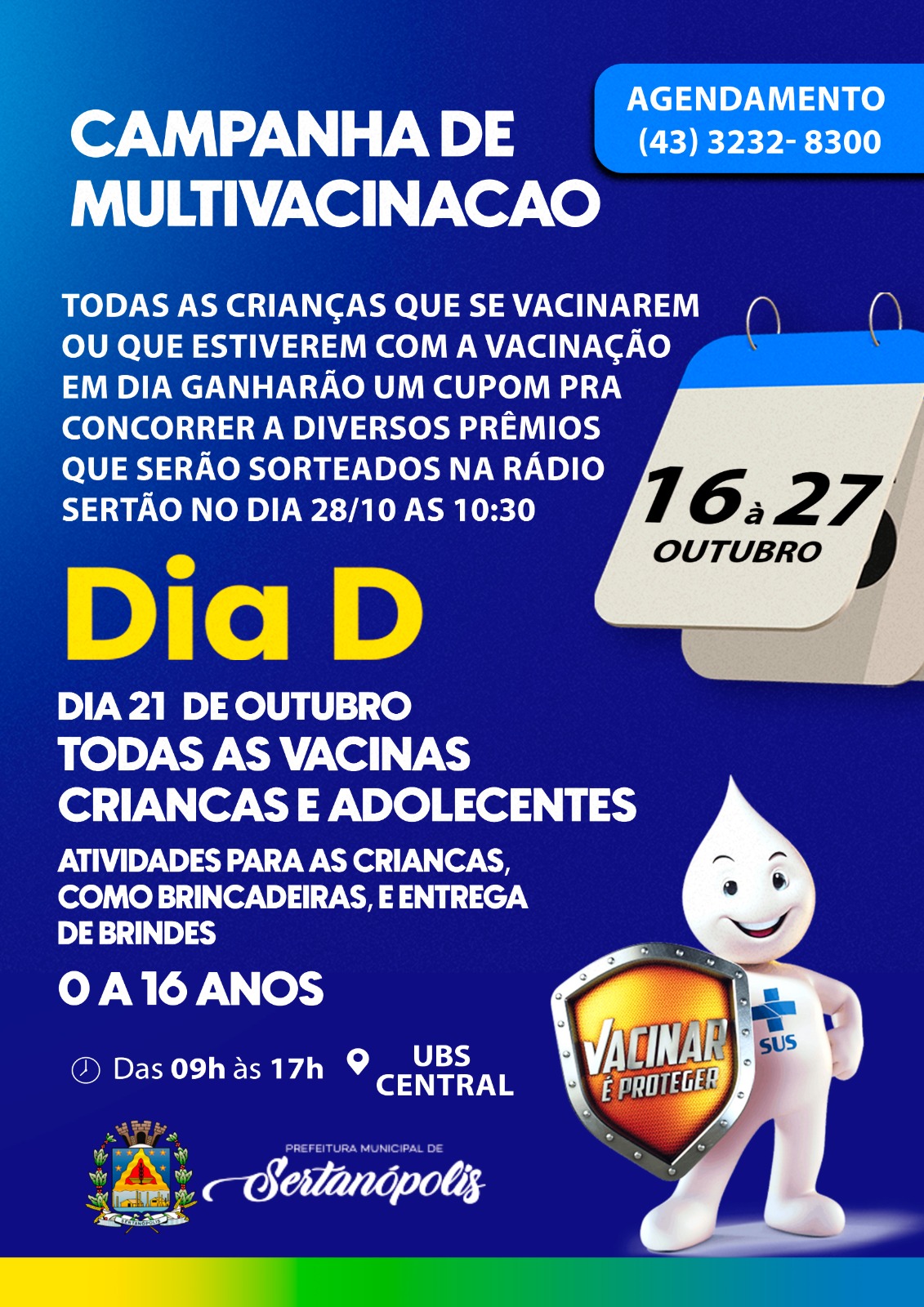 O dia D da campanha de multivacinação será realizado neste sábado, 21 de Outubro, das 09h00 ás 17h00, na Unidade Básica de Saúde (UBS) Central, Paulo Roberto Martins em Sertanópolis. A ação busca atualizar a carteira de vacinação de crianças e adolescentes de 0 a 16 anos.