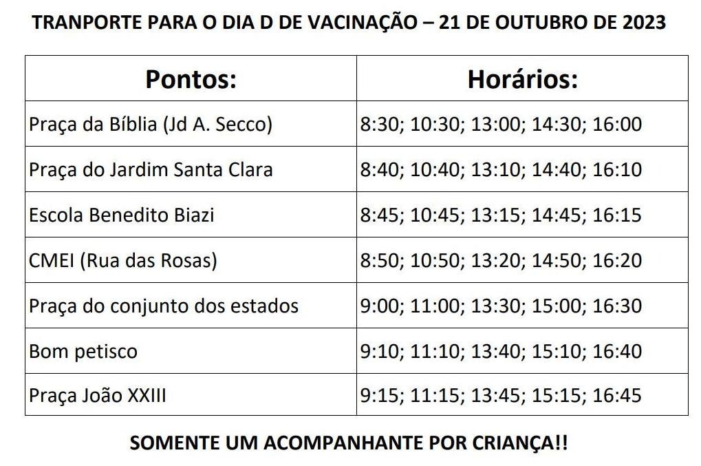 No sábado será disponibilizado transporte gratuito para as crianças de bairros distantes. Confira o itinerário abaixo: